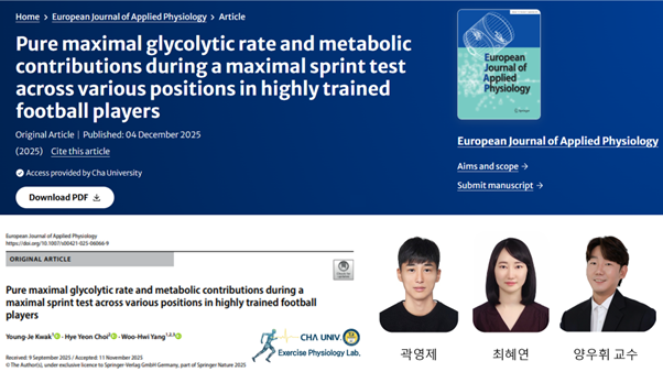 우리 대학 스포츠의학대학원 운동생리학실 곽영제 석사과정생은(제1저자) 2025년 12월 04일 자로 운동생리학 및 스포츠의과학에서 오랜 권위와 전통을 자랑하는 European Journal of Applied Physiology (IF: 2.7) SCIE급 국제학술지에 고도로 훈련된 엘리트 축구 선수들의 다양한 포지션에 걸친 최대 스프린트 동안 순수 최대 해당과정률과 대사 기여도에 관한 연구를 출판하였다.